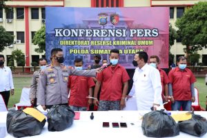Direktur Reskrimum Polda Sumut, Kombes Pol Tatan Dirsan Atmaja didampingi Kabid Humas, Kombes Pol Hadi Wahyudi perlihatkan barang bukti, Senin (14/3/2022).(Dedi)