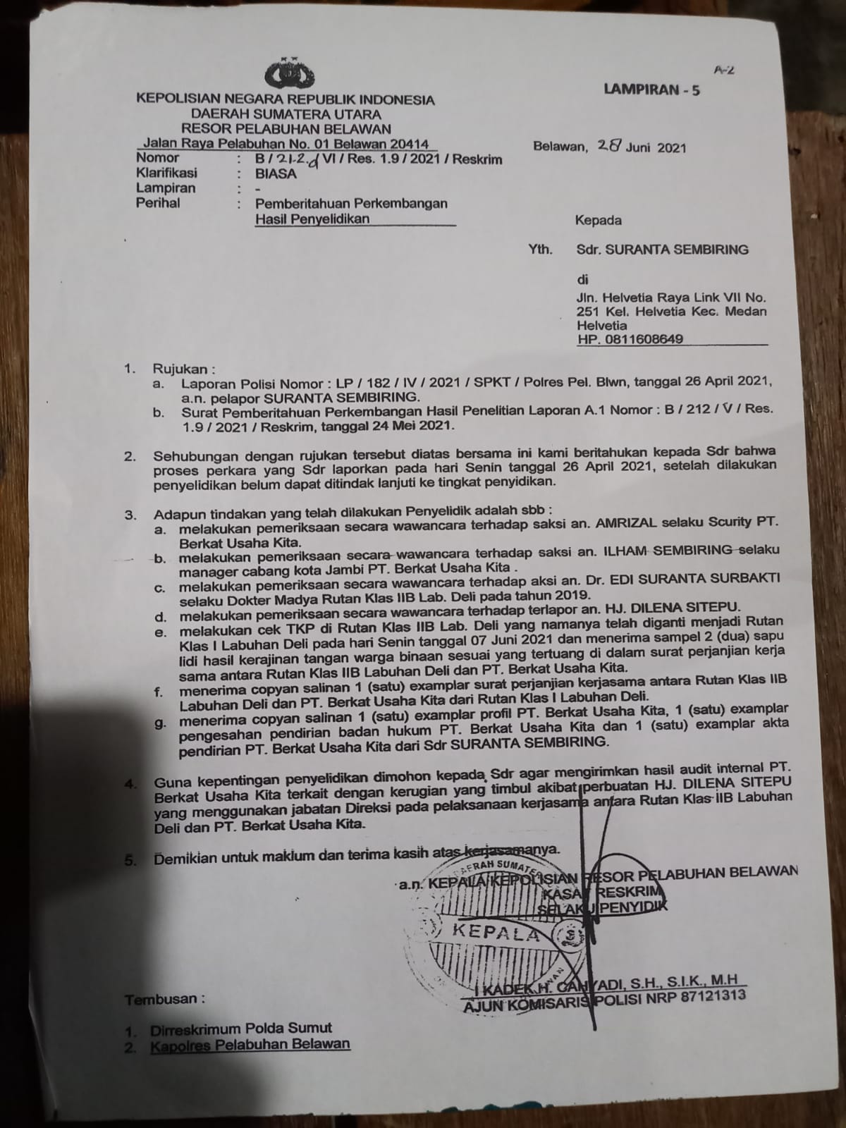 Kemudian Surat Pemberitahuan Perkembangan Hasil Penyelidikan No.B/212E/XI/Res 1.9/ 2021/Reskrim, yang menyatakan laporan pelapor bukan tindak pidana sehingga penyelidikan atas perkara tersebut dihentikan Polres KP3 Belawan.
