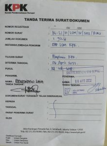 Demikian disampaikan Sekretaris Umum B. Naso bersama Ketua DPW LSM Komunitas Pemberantas Korupsi Jawa Barat Riswan Pasaribu usai membuat berita acara laporan resmi bernomor KL-LI/01/LSM/IV/2022/RIAU tertanggal 4 April 2022 yang diterima oleh KPK, Rabu (06/04/2022).
