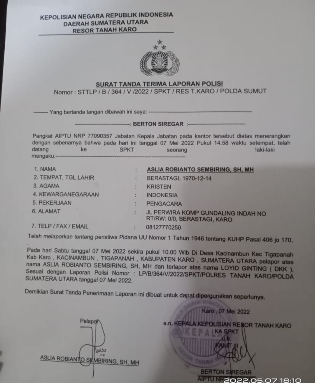 Laporan tersebut tertuang dalam Surat Tanda Terima Laporan Polisi (STTLP) dengan Nomor : STTLP/B/364 /V/2022/SPKT/Res T. Karo/ dengan terlapor LGRM dkk atas peristiwa pidana UU Nomor 1 tahun 1946 tentang KUHP Pasal 406 Jo 170.