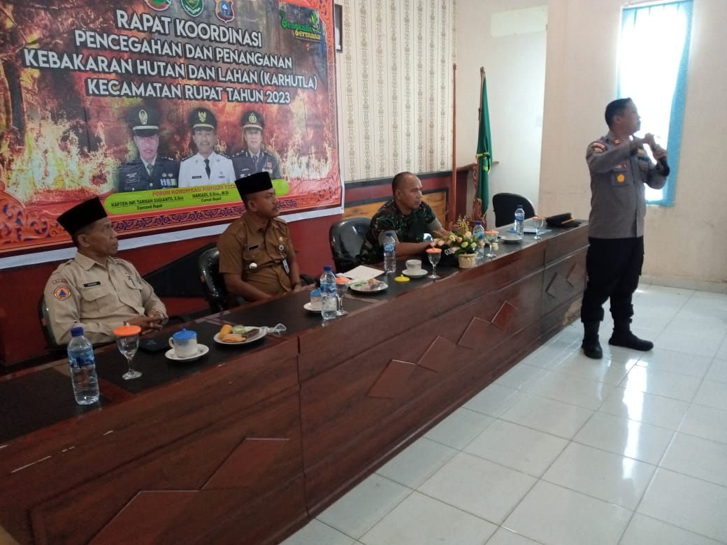 Menindaklanjuti Atensi dari Presiden RI terkait pencegahan Karhutla di seluruh Tanah air,dan sekaligus penanganan kebakaran hutan dan lahan tersebut Forum Komunikasi Pimpinan Kecamatan (Forkopimcam) Rupat gelar Rapat Koordinasi (Rakor) bersama yang dihadiri Kapolsek Rupat,Iptu Siswoyo,SH, DanRamil 04 Rupat Kap.Inf.Tarman Sugianto,S.Sos,Camat Rupat Haria di,S.Sos,M.Si, Para Kepala Desa/Lurah, Tokoh masyarakat, Sejumlah Anggota TNI Koramil 04 Rupat, Anggota polsek Rupat, Tim BPBD, Damkar,Masyarakat Peduli Api(MPA)dan Petugas lainnya.