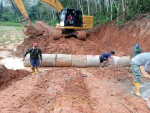 “Gorong-gorong ini salah satu penunjang pembukaan jalan yang saat ini kami laksanakan sepanjang 4 kilometer Lebar 6 Meter. Pada kegiatan ini terdapat aliran air yang harus kita pasangkan gorong-gorong, sehingga nantinya tidak menggenangi badan jalan,” pungkasnya.