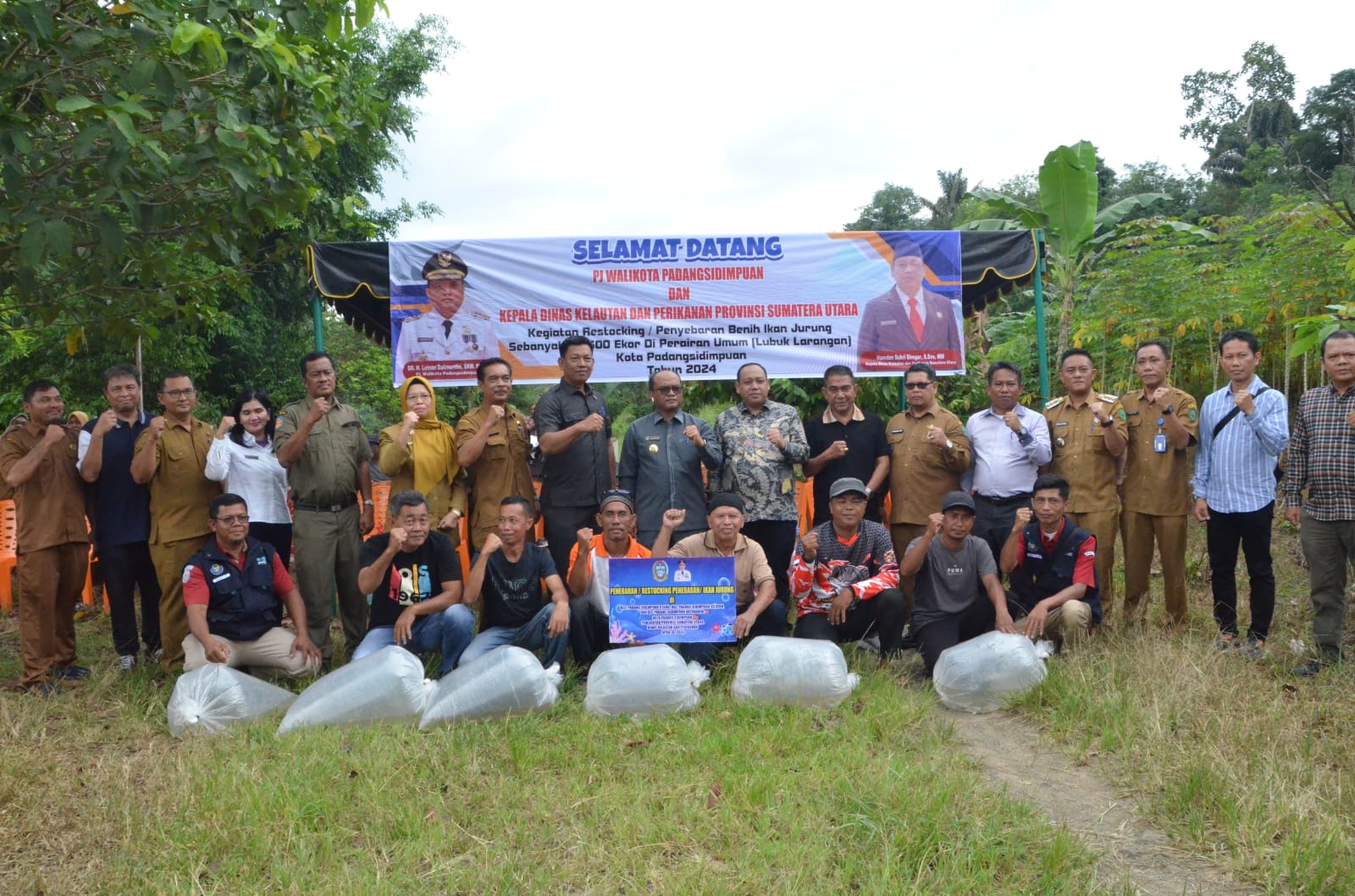 Padangsidimpuan, Pindo- Pj. Wali Kota Padangsidimpuan, Dr. H. Letnan Dalimunthe, SKM, M. Kes bersama Kepala Dinas Kelautan dan Perikanan Provinsi Sumatera Utara menebar benih ikan di Desa Pudun Jae, Kecamatan Padangsidimpuan Batunadua, Selasa (07/4/2024).
