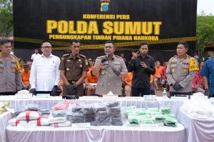 Kapolda Sumut Irjen Pol Whisnu Hermawan Februanto, S.I.K., M.H. mengungkapkan “Satu bulan ini Polda Sumut dan jajaran berhasil mengungkap 578 kasus dengan 713 tersangka. Dengan barang bukti 175,63 kg sabu, 218,39 kg ganja, dan 33.008 butir pil ecstasy. Ini bisa menyelamatkan 1,6 juta masyarakat.”