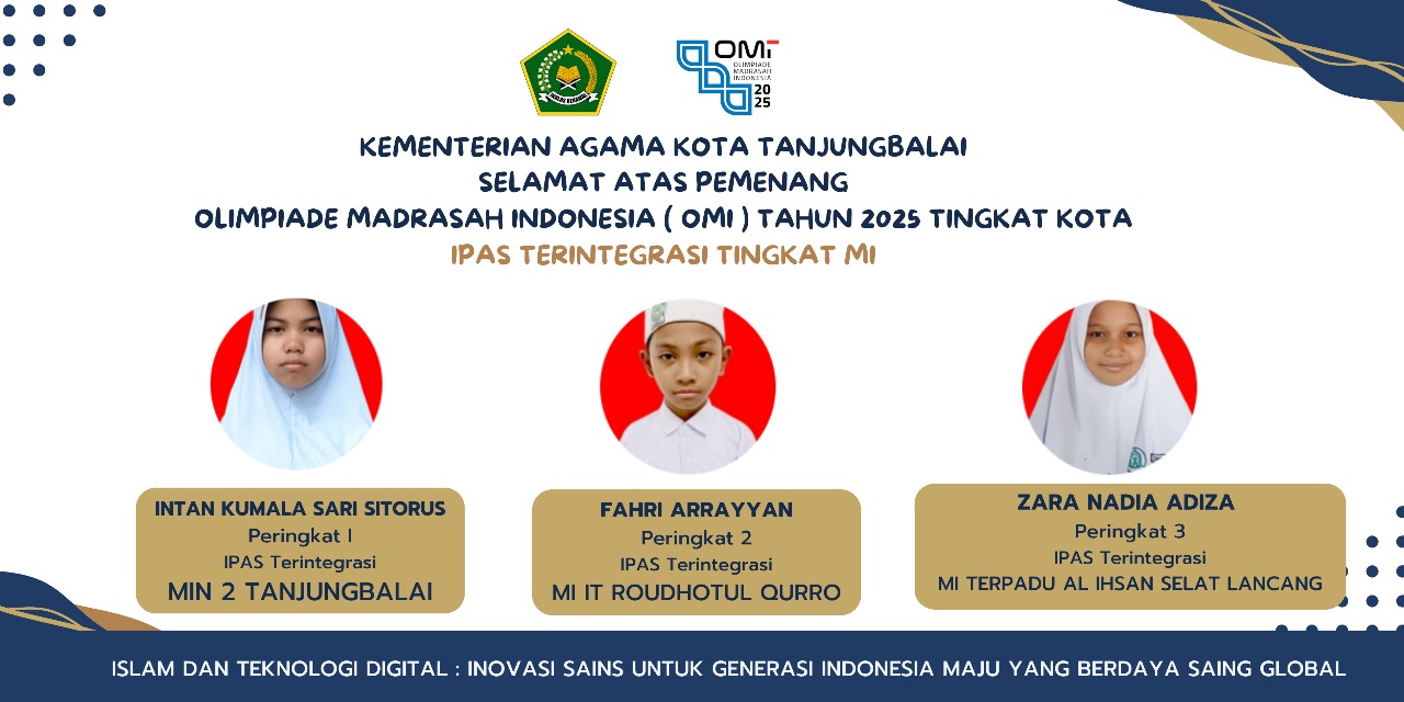 Prestasi membanggakan kembali ditorehkan oleh siswa Madrasah Ibtidaiyah Negeri (MIN) 2 Kota Tanjungbalai bernama Intan Kumala Sari Sitorus mendapat peringkat Ke I IPAS Terintegrasi, peringkat ke 2 Fahri Arrayyan siswa MI IT Roudhotul Qurro dan peringkat 3 Zara Nadia Adiza Siswa MI Terpadu Al Ihsan Selat Lancang di ajang Olimpiade Madrasah Indonesia (OMI) Tingkat Kota Tanjungbalai.